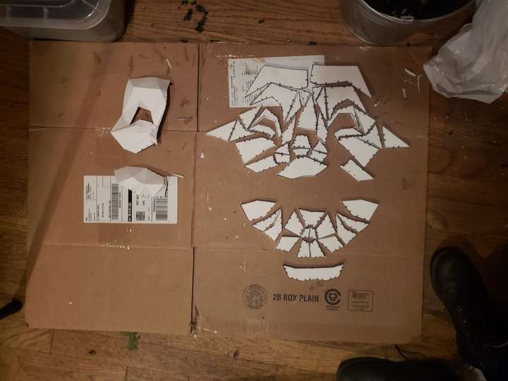 I took the final paper versions and divided them in a way that probably only makes sense to me, making sure to add registration marks that would help me to put them back together later. These were then transferred to foam and glued together with contact cement. The stuff has potent fumes, so be sure to do it near a window and wear a respirator!